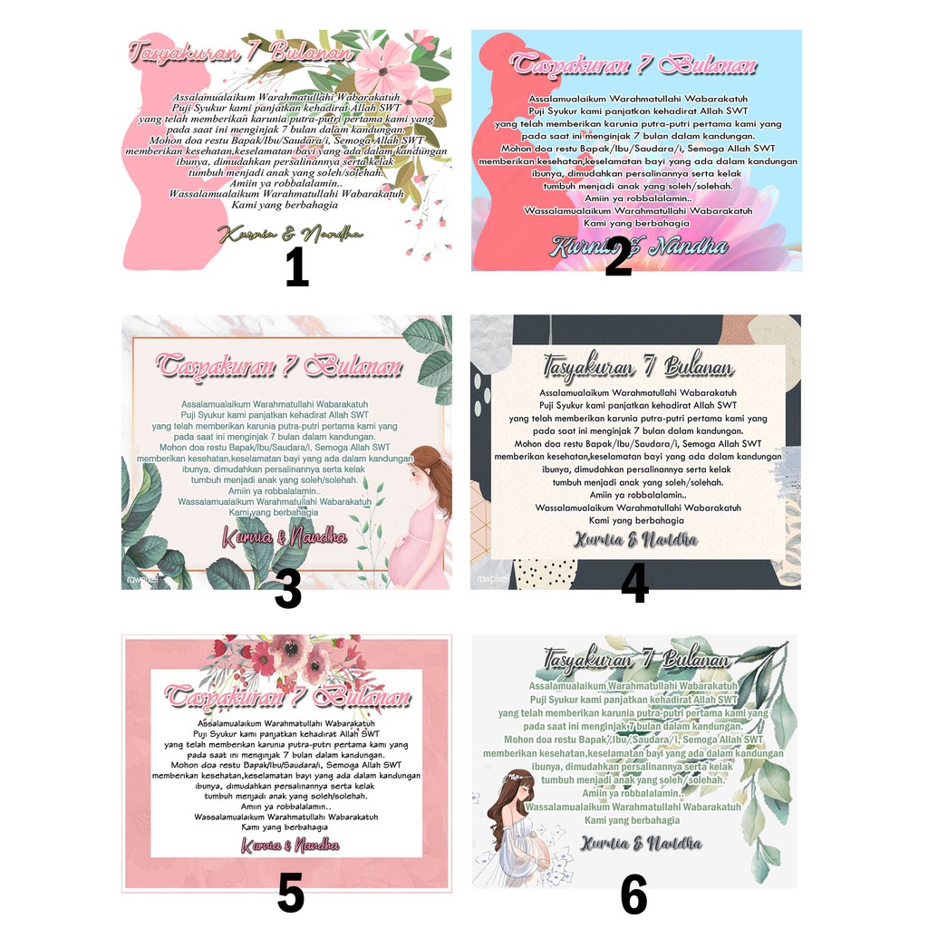 Template Ucapan Syukuran 4 Bulanan from cf.shopee.co.id Pengiriman cepat pembayaran 100% aman. Kartu ucapan bisa di tempelkan di kotak nasi, kotak kue atau biasanya disebut kotak berkatan. Contoh ucapan di atas juga dapat dibuat dengan menggunakan kartu ucapan sehingga memiliki kesan yang lebih spesial. Tidak harus melakukan syukuran usia kehamilan 4 bulan atau 7 bulan. 40 trend terbaru ucapan syukuran 7 bulanan kehamilan. Download gratis vector corel draw kartu ucapan 7 tujuh bulan kehamilan / mitoni ( jawa ) format.cdr. Format undangan 7 bulanan kehamilan pdf. Undangan tedak siten/ turun tanah / aqiqah/ 7 bulanan/ ultah murah ….